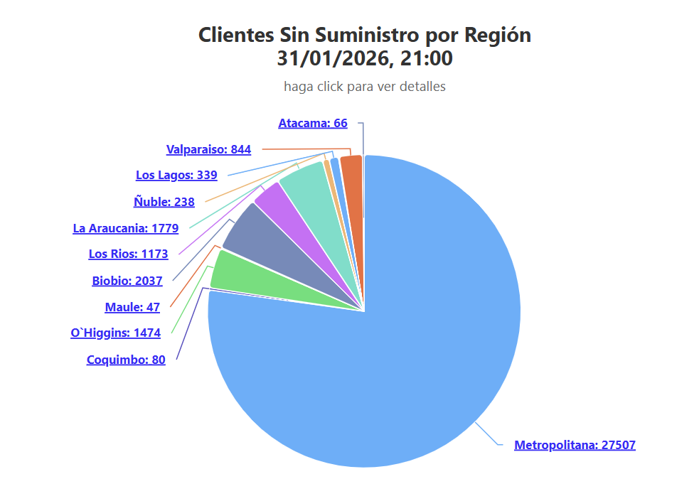Hasta las 21:00, 25.507 clientes se encuentran sin suministro eléctrico según la Superintendencia de Electricidad (SEC).